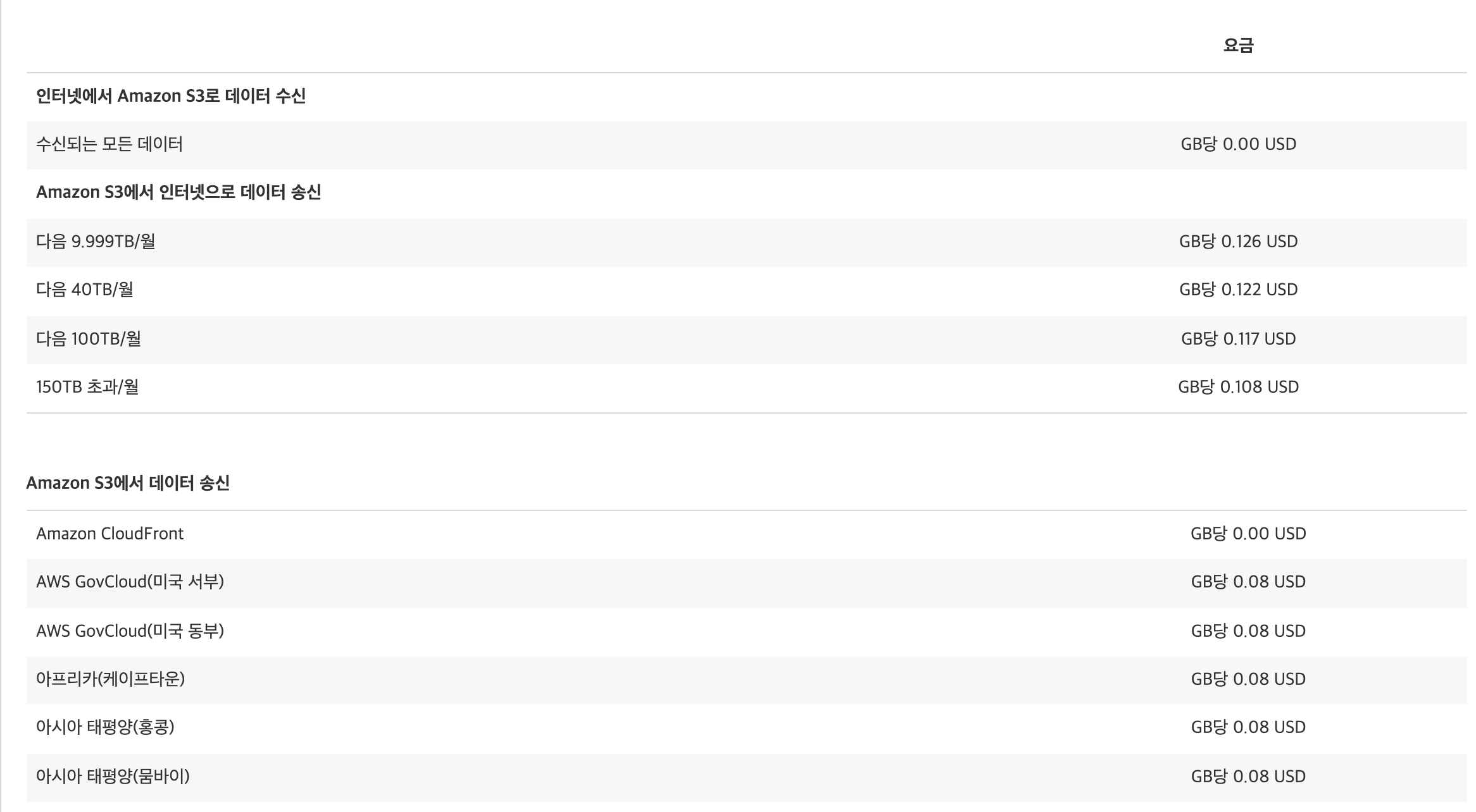 - 아시아 태평양 서울 기준으로 Client에서 S3로 데이터를 요청했을 때 1GB당 0.126$(약 한화 150원 : 2021년 12월 기준) 정도가 부과됩니다.