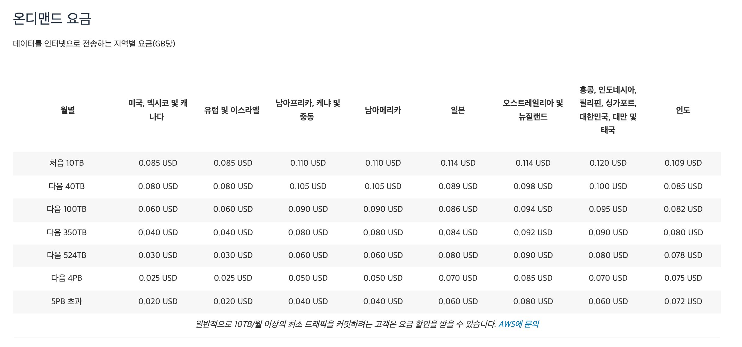 - 처음 10TB는 위의 내용과 동일하고 10TB 이상일 경우 할인된 요금이 순차적으로 적용됩니다.