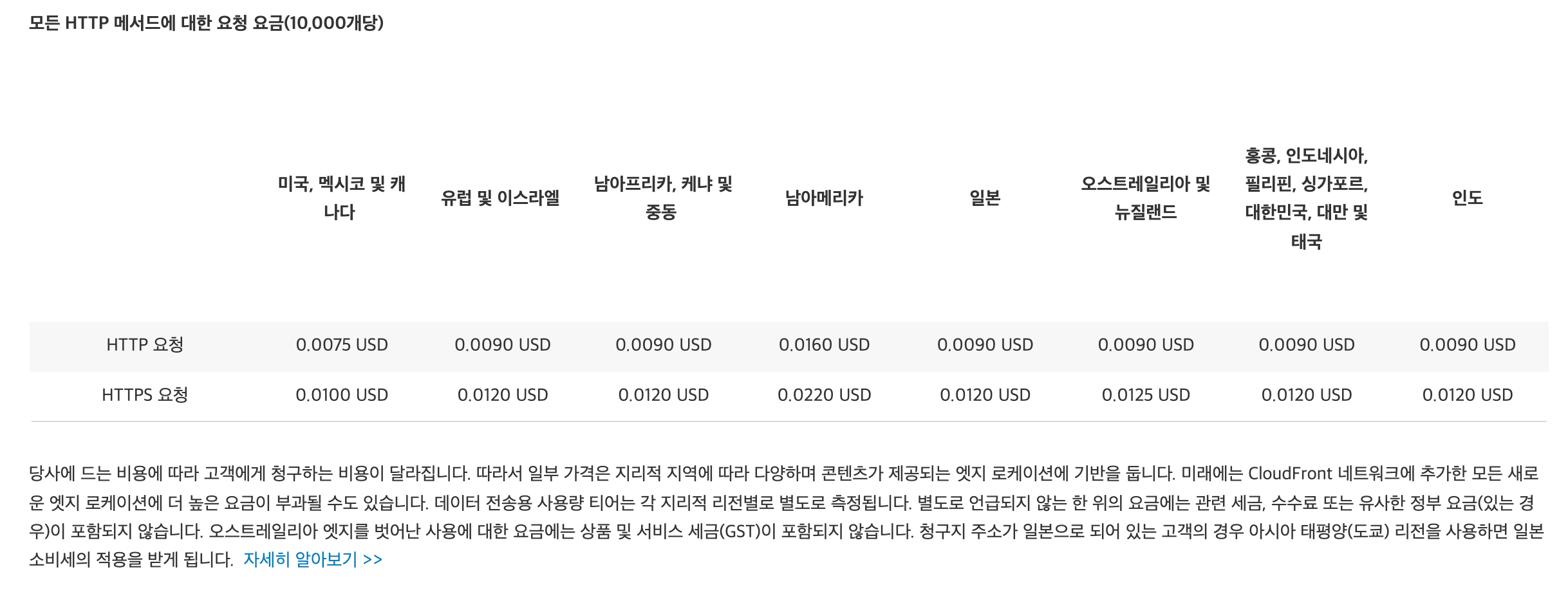 - 대한민국이 포함되어있는 region에서는 HTTP는 10000개 요청당 0.0090$(약 한화 11원 : 2021년 12월 기준)의 트래픽 요금이 발생합니다.