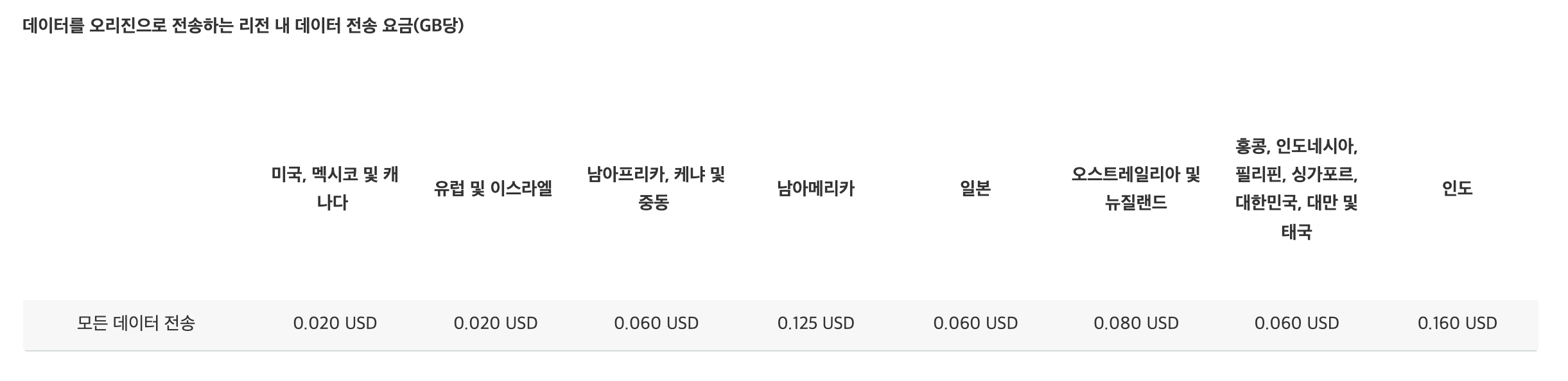 - 대한민국이 포함되어 있는 region으로의 데이터 전송은 0.060$(약 한화 71원 : 2021년 12월 기준) 정도가 부과됩니다.