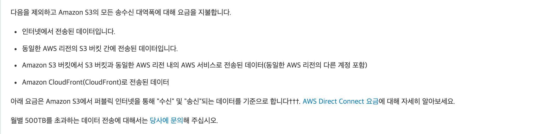 - 현재 S3의 버킷과 동일한 Regsion에 있는 AWS 서비스로 전송하는 트래픽 요금은 무료입니다.