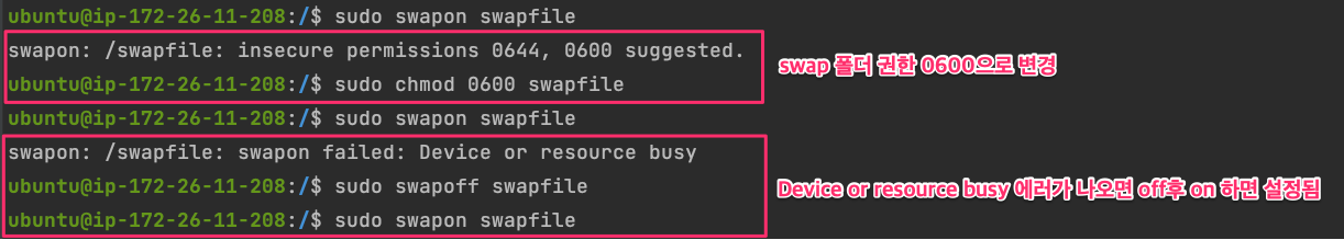 먼저 Swap 메모리를 Swap 파일로 포맷하여야 합니다.