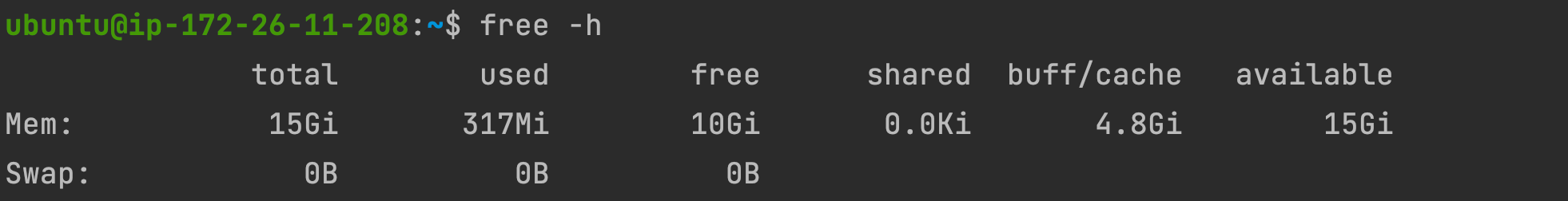 일단 현재 EC2 인스턴스의 메모리를 살펴보면 전체 설치된 메모리(total)는 약 16G입니다.