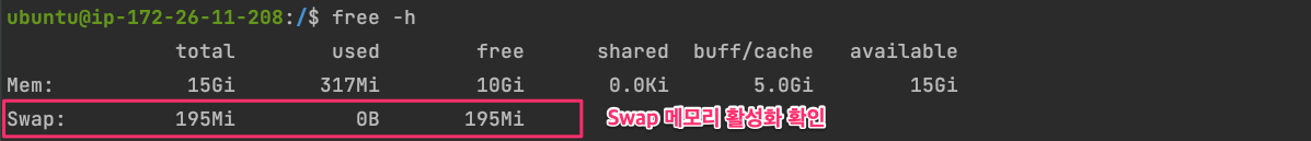 위에서는 EC2 인스턴스에서 free 명령어를 사용하여 Swap 메모리를 확인해 보았습니다.