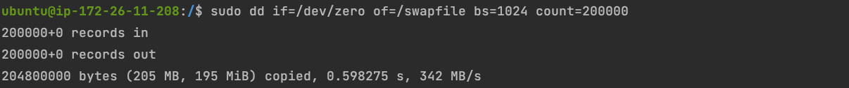 sudo dd if=/dev/zero of=/swapfile bs=1024 count=200000